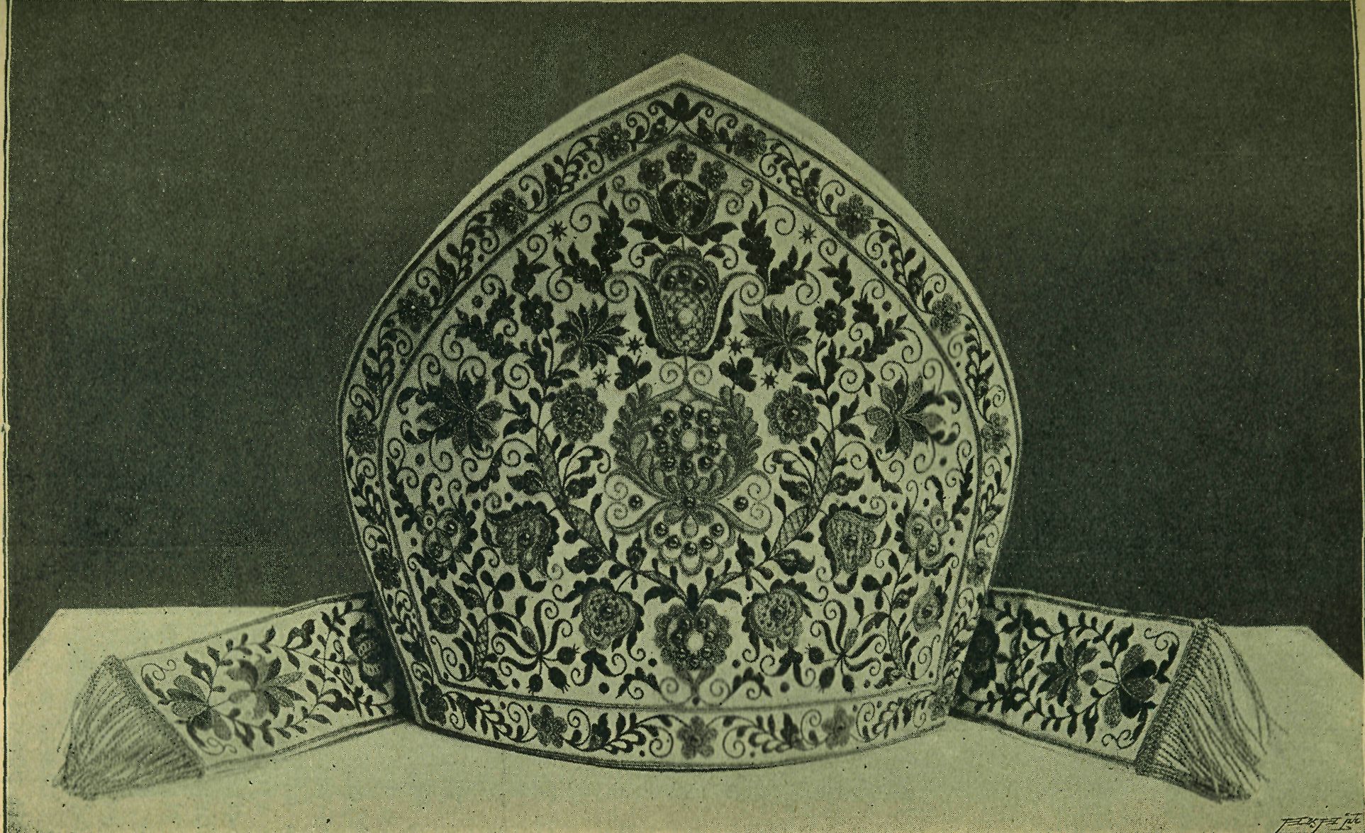 Čís. 1. Mitra s vyšíváním v národním ornamentu dle komposice prof. Jos. Šímy. Dar pí. P, M. Neureutterové biskupu Strossmajerovi. (Provedeno v pražské Městské průmyslové škole dívčí.)