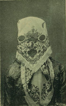 velmi podobna hlavě ženy v čepci. K vínku braly pak do kostela, na pouti a pod. opět šátky karmazínové; v předu kladly je přes zadní okraj vínku, kdež je připevňovaly, aby šátky se nesmekaly, v týle vázaly je přes prostřední roh, postranní rohy opět jen jednou přehazujíce, nebo byl-li šátek po okrajích široce vyšit, takže nesnadno se vázal, jen překládajíce a sešpendlujíce; vyšité rohy kladeny, pokud stačily, na ramena. (Viz obraz číslo 3. pohled ze zadu.) Při vázání toho bylo dbáno, aby část okolku s krajkou byla obrácena k obličeji, t. j. aby „ušička" slušně byla upravena. :