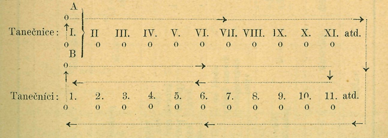 Hudebníci zahrajou písničku „Utíkej, Káčo", při níž tanečníci dle taktu kolíbají se v právo v levo. Jakmile začnou muzikanti hrát tuto píseň podruhé rychleji, tu se krajní tanečník (1.) přibližuje k tanečnici (I.)) jež ustoupí ze svého původního stanoviska zpět (do A). Tanečník postoupí v před (do B). Oba vezmou se za ruce, a to tanečník se uchopí svou levicí její pravice a, stojíce bočně vedle sebe, zdvihnou paže nad hlavy tanečnic, jejichž řadu a pak řadu tanečníků přetančí a tak na svá původní místa se navrátí, načež tanečník (1.) chytá tanečnici (I.), jež před ním