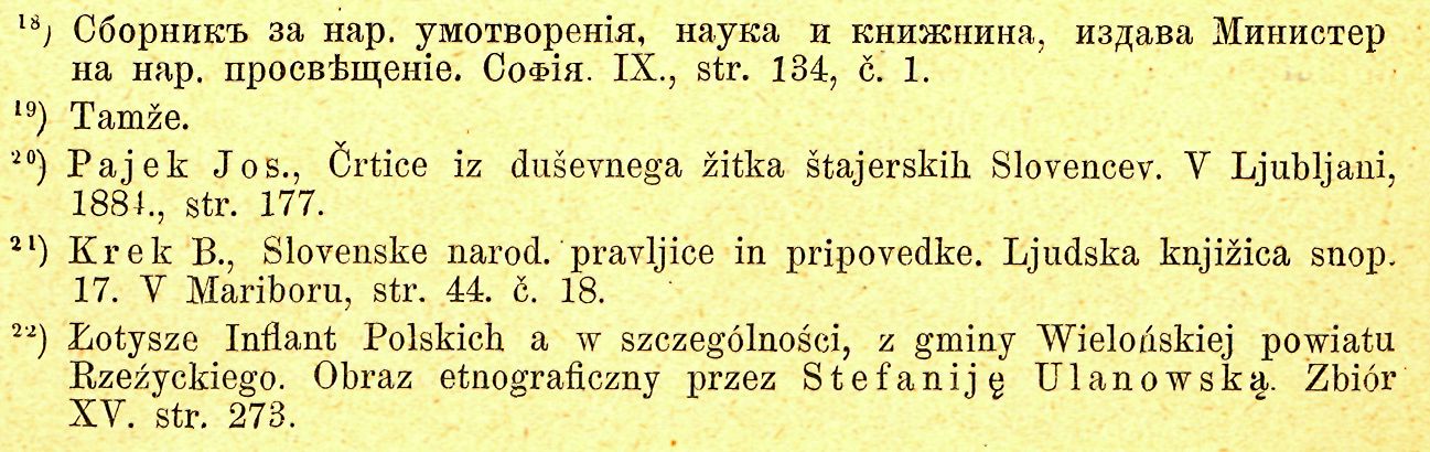 V hlavní osnově shoduje se s tímto podáním jiná verse bulharská; žena otřela obilím znečištěné dítě, Bůh se rozhněval a chtěl klas, který šel až od kořene, odtrhnouti, ale na prosbu psa nechal aspoň svrchní část klasu.18) — V Bulharsku rozšířena jest i varianta této legendy, vyskytující se i jinde, v níž se vypravuje, že původně místo sněhu padala na zemi mouka, ale když žena očistila dítě své kůrkou chlebovou, Bůh zaklel mouku, aby se stala sněhem.19)