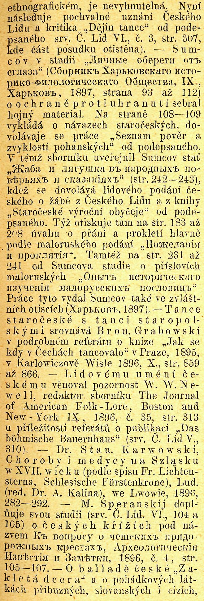 podává rozsáhlou literaturu Eugen Monseur, Bulletin deFolklore II., 5., str. '.'37. — Slowianske n a z w y m i e j s c o w o s c i na S z 1 a s k u pruskim nazývá se výborná práce titan Drzaždžyňského o místních jménech slovanských v pruském Slezsku v Karloiviczově Wis!e, Warszawa, 1896, X., č. a., str. 630 a d. Práce je založena na základě historických pramenů,, z nichž jsou vždy vybrány jednotlivé' názvy osad (abecedně spořádaných) zároveň s letopočty. — Svatojanské ohně v Čechách líčí (podle Wisíy, téhož čísla, str. 643, Michal Witanowski) Jan G. Wo r lis, Archiv für die Geschichte Schlesiens, Sorau, 1798, str. 19 až 8'i (o ctění ohně v Evropě s výkladem sobotek ve Slezsku, v Lužici a v Čechách). — V témž čísle na str. 668 až 669 podává B r o n. G r a b o w s k i tresť české knížky: Bohabojní a svatí cechové, Z yydání v Praze, r. 1630, otiskuje Dr. Čeněk Z í b r t (Otisk zvláštní ze Živnostníka). — Pověsti o Me lužině, Hejkalovi, Bará-š k o v i, Domácím hadu a pod. vypravuje Břetislav Jelínek ve svém článku: Materialien zur Vorgeschichte und Volkskunde Böhmens, Mittheilungen der Anthropologischen Gesellschaft in Wien, XXL, Wien, 18Ü6, str. 195—23^. — Scholz 0., Besprechungsformeln (zajímavá sbírka zaříkadel, shodných s našimi lekovadly českými), Mitthei-lungen der Schlesischen Gesellschaft für Volkskunde (red. Dr. F. V o g t a 0. Jiriczek, Breslau 1896, č. 4, str. 46—49. Tamtéž Str. 53 -5(i: Dr. Kith-nau, Eine Bauernhochzeit in Woitz bei Iseisse uins Jahr 1850. — A. Herrmann v článku: Die ethnographische Gestaltung der Bevölkerung Ungarns, Ethnologische Mittheilungen aus Ungarn, Budapest, 189(5, V., č. 4, str. 76—77, věnuje pozornost Slovanům v uhrách, všímaje si především Slováků po stránce národopisné. Důležitá je další studie tamtéž (str. 81—85) Die naturwissenschaftlichen Kenntnisse der Magyaren zur Zeit der Landnahme. L o v-c sány i J. dokončuje studii oznámenou již v Č. Lidu: Der Tod im Glauben und Brauch der Slovakrn (str. 92-96).