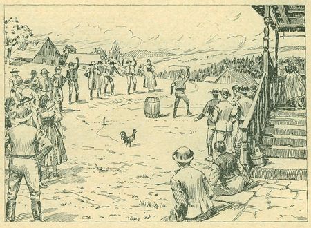 Jiný způsob, jak stínali kohouta, znázornil zdařile a věrně Ad. Lieb-scher. Kohout uvázán na provázku u kolíku a chasník s šátkem na očích marně se rozhání kolem sudu.**)
