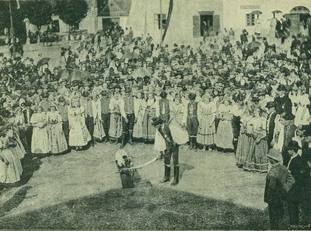 hudby a obchází celá družina stárkovská třikráte kolem máje, hudci odejdou na svá místa, beránek postaví se nedaleko máje a stárci se svými stárky provádějí zajímavý, obřadový tanec kolem berana. Broušení šavlí