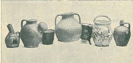 v potoce si dochovati); dále třínohý, hrnku podobný cedník na nudle, žlábek pro ptáčka a žlábek na vodu pro včely, zvláštní nádoba к vlastnímu řemeslu na vodu к namáčení rukou, soudečky na kořalku, džbánky „kouzelné", z nichž se neznalec nedovedl napiti, nýbrž se polil. К takovýmto dílům „z pilnosti" sluší přičísti i některé předměty mimo praxi sahající. Tak zhotovil kterýsi hrnčíř třebovský v I. polov. 19. stol. sošku cikána pěkně polévanou v různých barvách. Soška svědčí o správném pojímání předmětu, jsouc velmi realisticky podána. Ze starší doby jsou pak to miniaturní nádobky, 2 talířky a džbánečky, kteréž svědčí o zálibě v umělém díle, třeba že nemělo jiného účelu než vzbudit! obdiv. Bylyť nádobíčky, z nichž žádná ne-