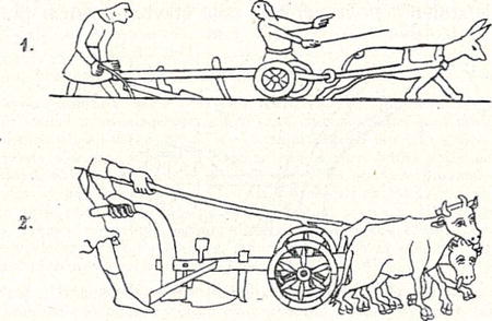 Kompletní pluh s koly, nožem, event. i odvalem vidíme už na miniaturách anglosaských kalendářů (srv. obr. 14 a 15) z X. а XI. století155), dále na pověstném koberci z Bayeux (obr. 16, 1), jehož vyší-