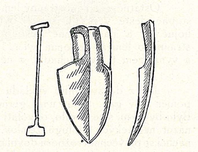 omezený, než abychom se mohli oň bezpečně opříti178). Neznám také dosud jiného nálezu, ani z doby merovejské, ani karolínske, ani ottonské; ba ani obrazy z XII. a XIII. století neukazují nám hodnověrné radlice asymetrické. Teprve v následující době se objevuje nesporně. Obrazy pluhů z XIV. а XV. st. sice ještě namnoze nás nechávají v pochybnostech179), ale z konce XIII. st. nebo z poč. XIV. máme v Čechách vzácný nález v zemanské tvrzi v Semonicích u Smiřic, kde se vedle řady jiných železných nástrojů a zbraní nalezly se i dva plužní nože a dvě široké jednostranné radlice železné s otkami (obr.21) spolu s pražským grošem Václava II.