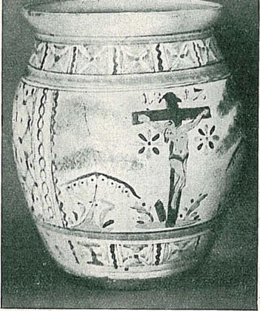 Charakteristickou barvou je tu převládající barva fialová, kterou nacházíme i na zobrazených obou džbánečkách, zvláště ve stejném provedení růžice na džbánečku po pravé straně, takže není pochyby, že všechny tři kousky vyšly z jedné dílny. Také toufar Zavřel, když jsem mu předložil několik různých talířků, označil dva s převládající barvou fialovou (obr. 20|A) za pavlické. Jsou ovšem v tomto provedení i starší práce určitě na západní Moravě vyrobené, jako na př. koutní hrnec z roku 1817 (obr. 21.) v Horáckém museu v Novém Městě na Mor., pocházející z Jackova