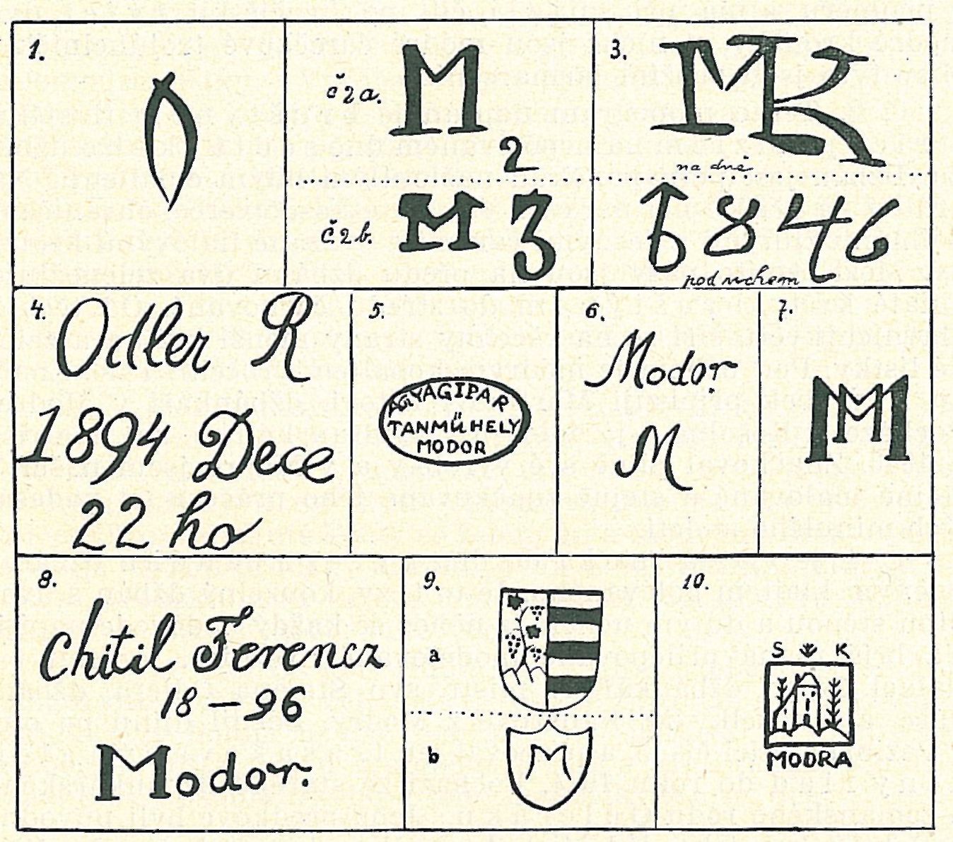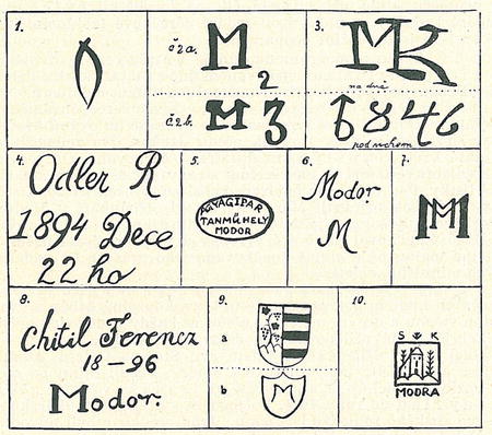 Č. 2 a. Na polévaném dně bílé oválné nemalované mísy (bílý šmelc), t. zv. pečenkové, je modrou barvou (šmolkou) štětcem růžičkovým napsána značka M. a vedle vpravo číslice 2. Podobně značkovaných výrobků nemalovaných i modře malovaných se dosud v Modre hojně nachází.1) Písmeno M značí buď Modru, jako výrobní místo, nebo bratry Müllery, džbánkáře, pracující v Modre v letech padesátých min. stol. Byli dva: Laurenc doložen r. 1842 v řím.-kat. matrice a Vence-slaus 1851. Jsou označeni sodalis figulus (hrnčířský